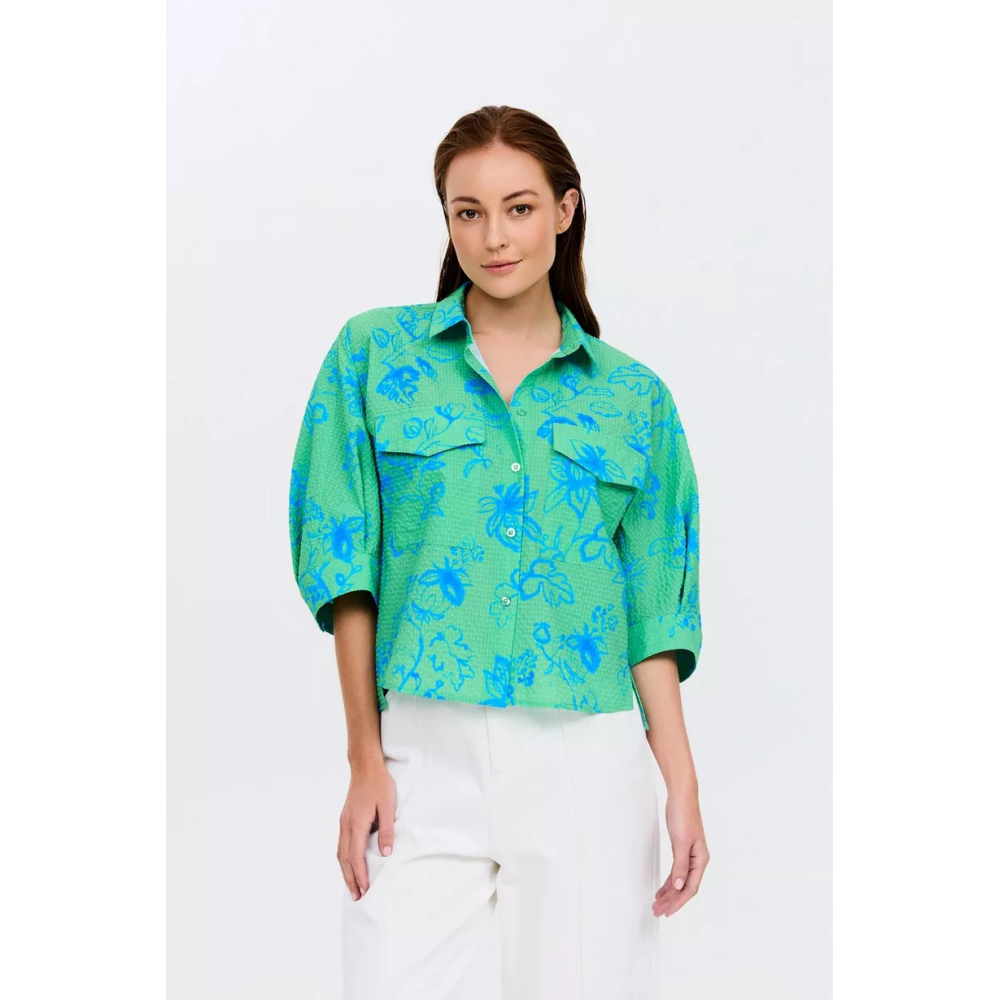 Blusa oversize verde con estampado floral en azul con tejido texturado.