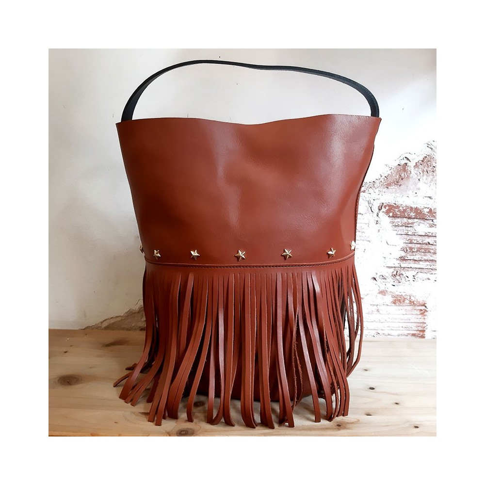 Bolso grande en forma de cubo con detalle de estrellas doradas y flecos.Cuenta con dos asas, una fija para llevar al hombro de 38 cm. y una más larga desmontable de 80 cm. para poder llevarlo cruzado o colgado.Medidas: 30 x 36 x 21 cm. (ancho, alto, fondo)