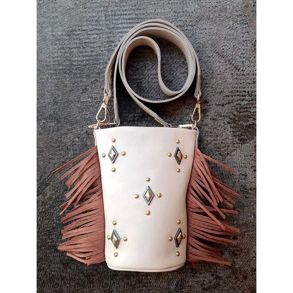 Bolso pequeño de piel con flecos en los laterales, tachuelas decorativas en el frente y doble asa ancha.