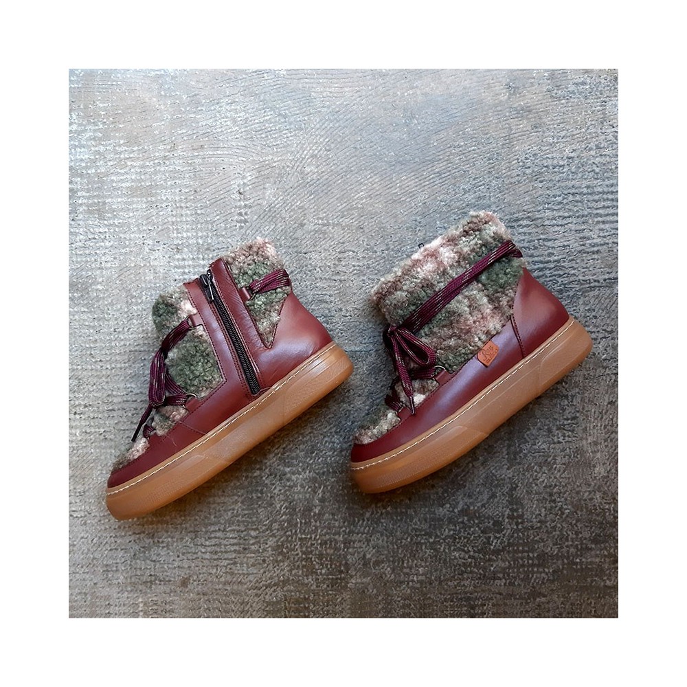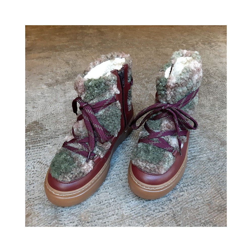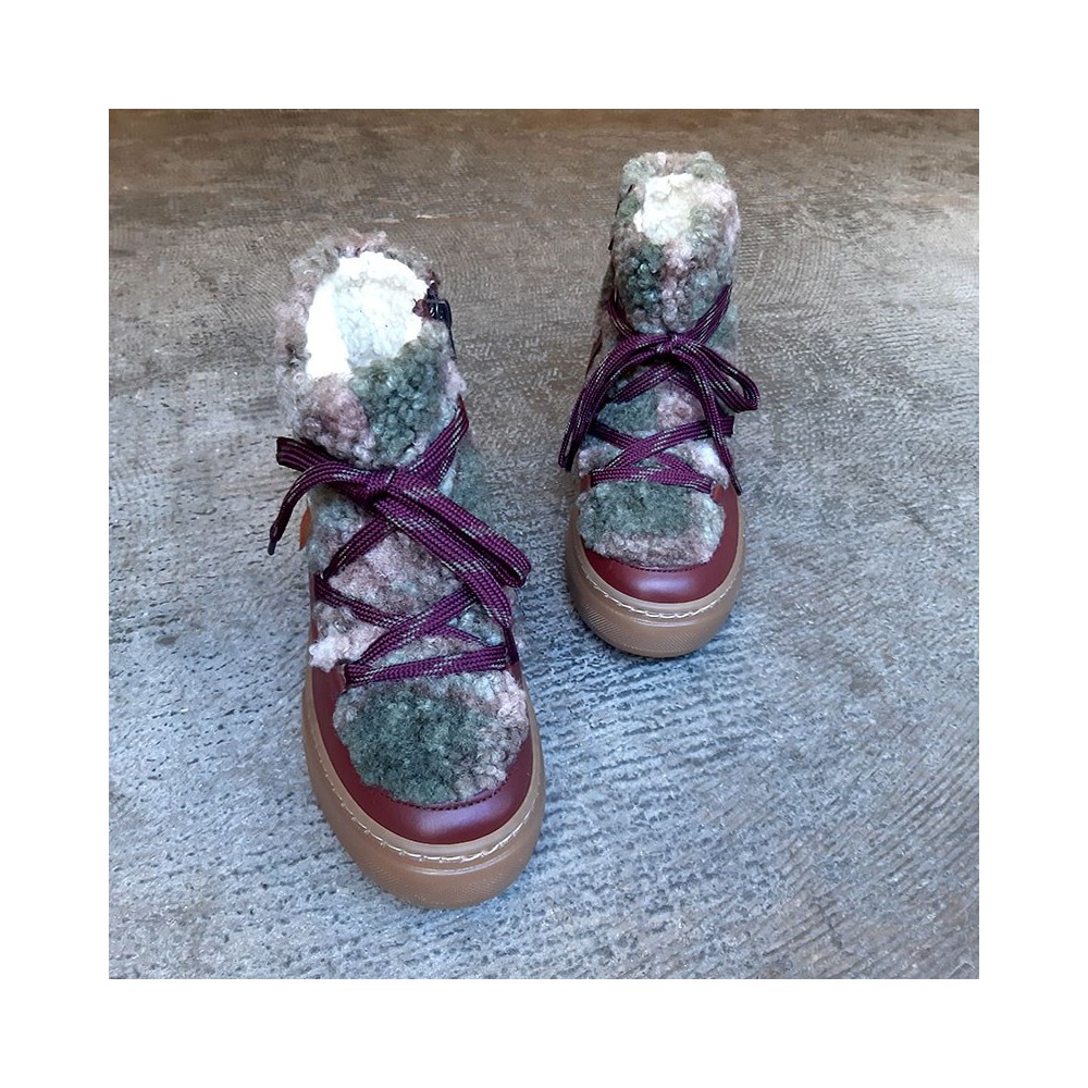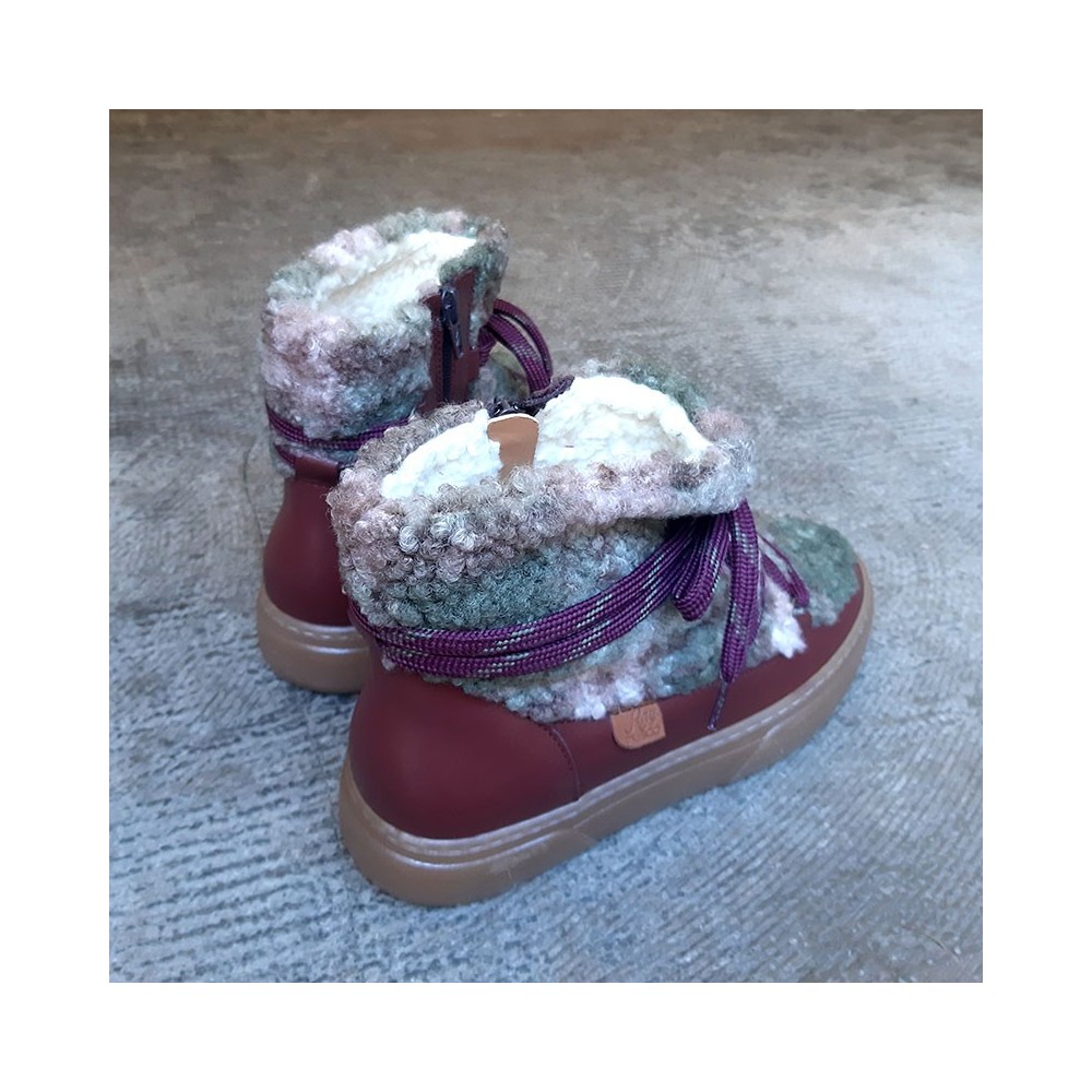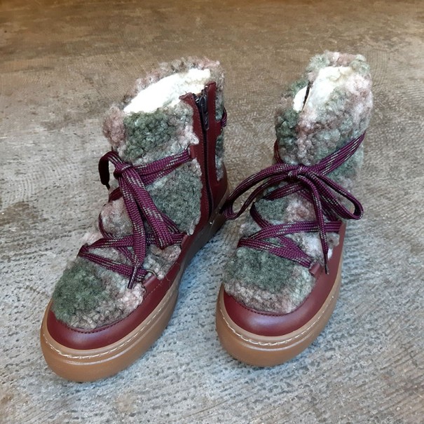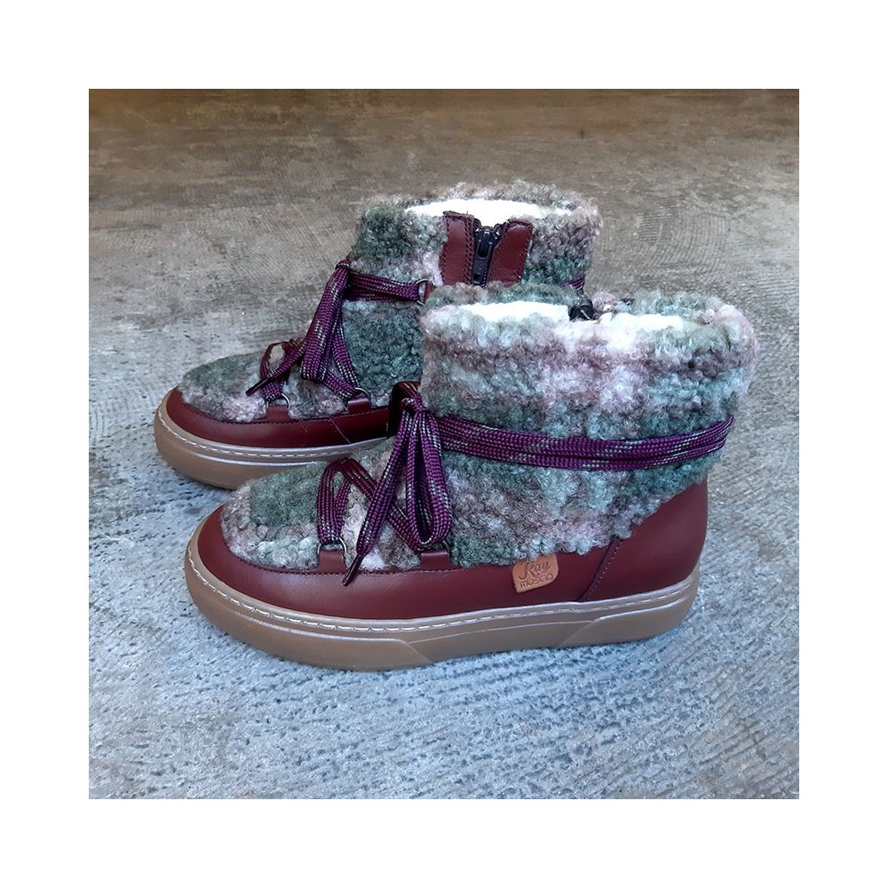 Botín burdeos combinado con borreguito en una combinación de verde, crudo y marrón.