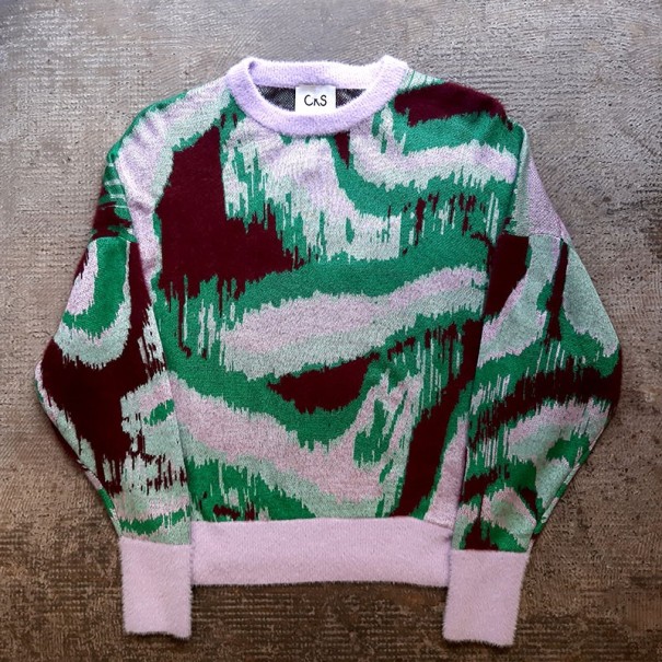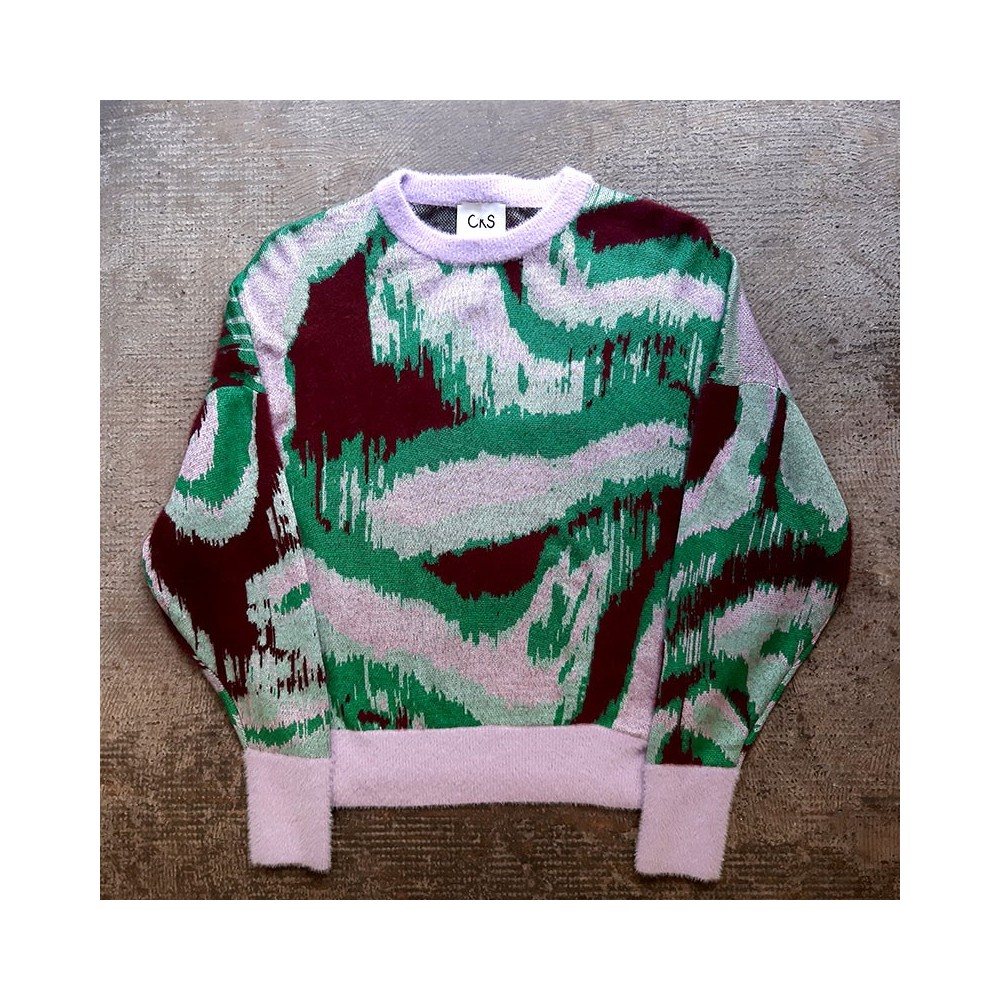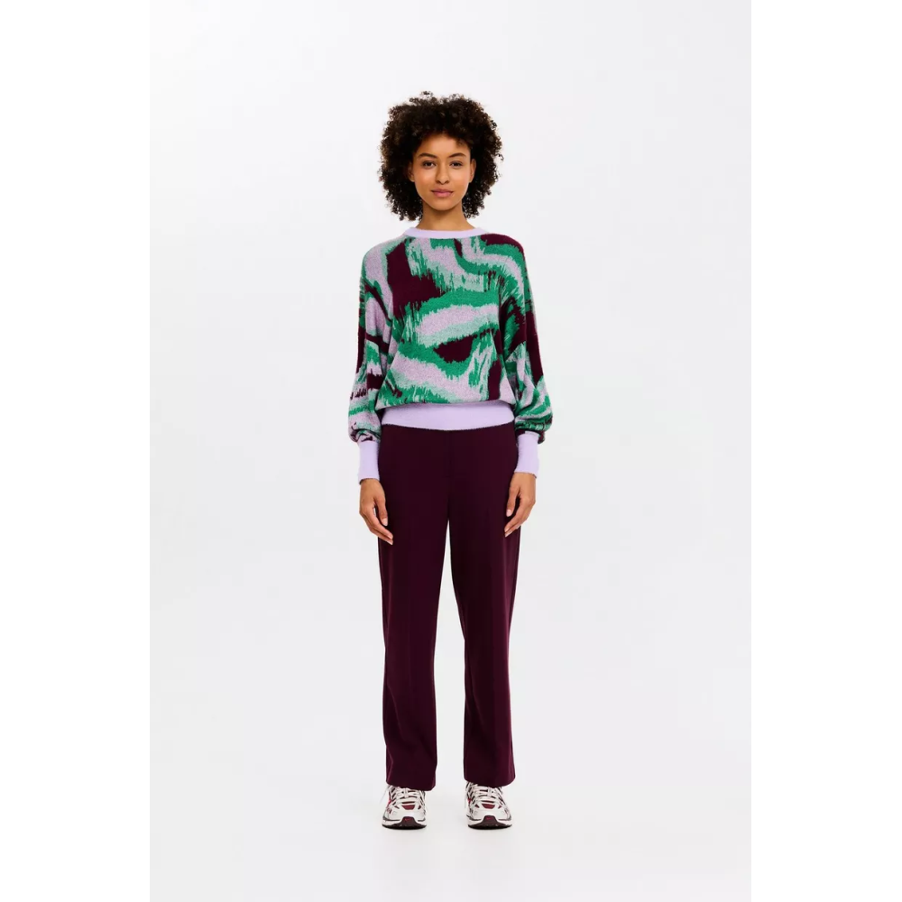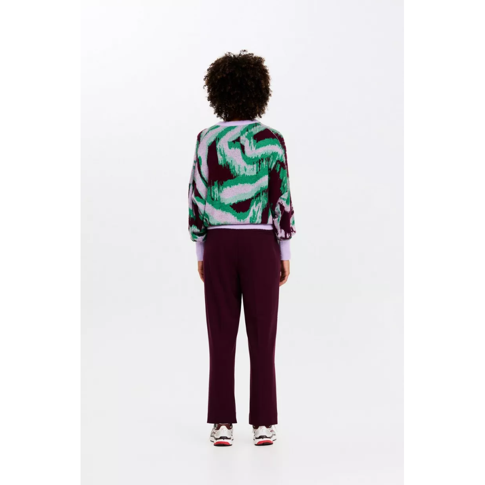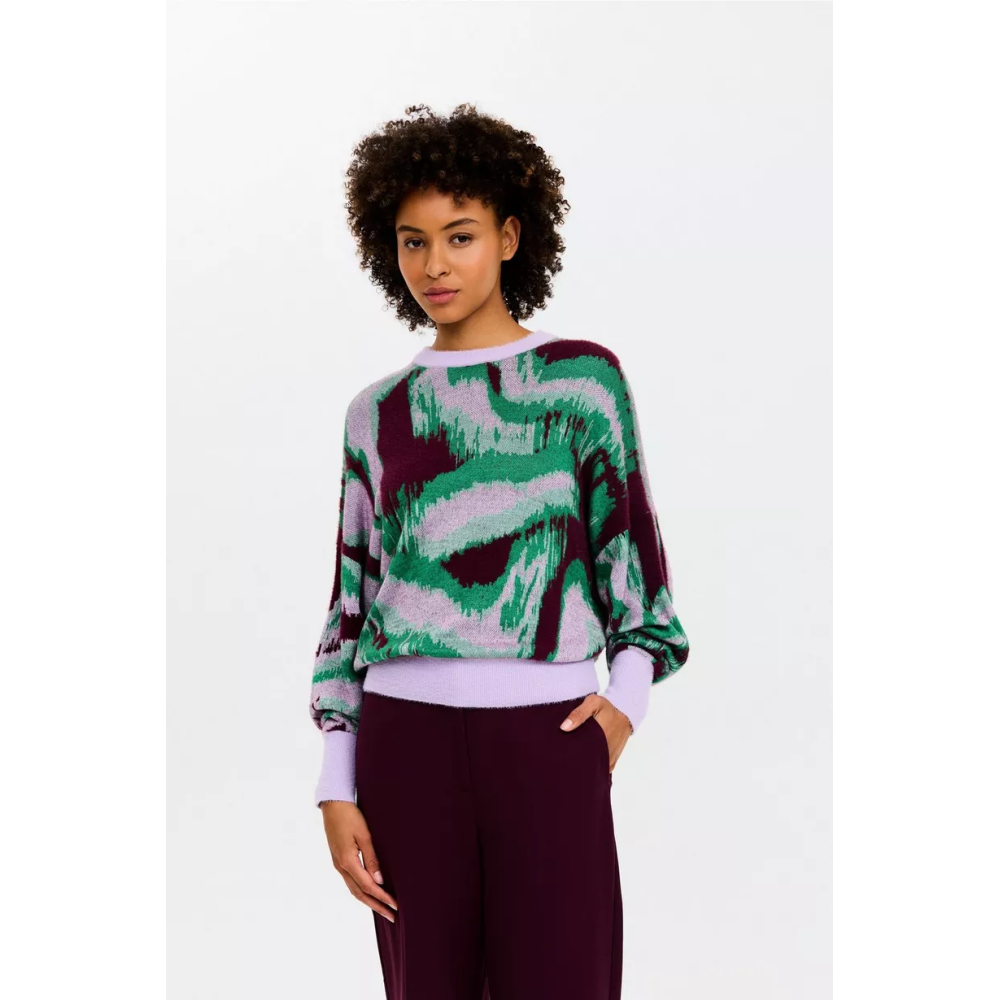 Jersey en tonos morados, granates y verdes, muy suave, tiene un efecto aterciopelado.