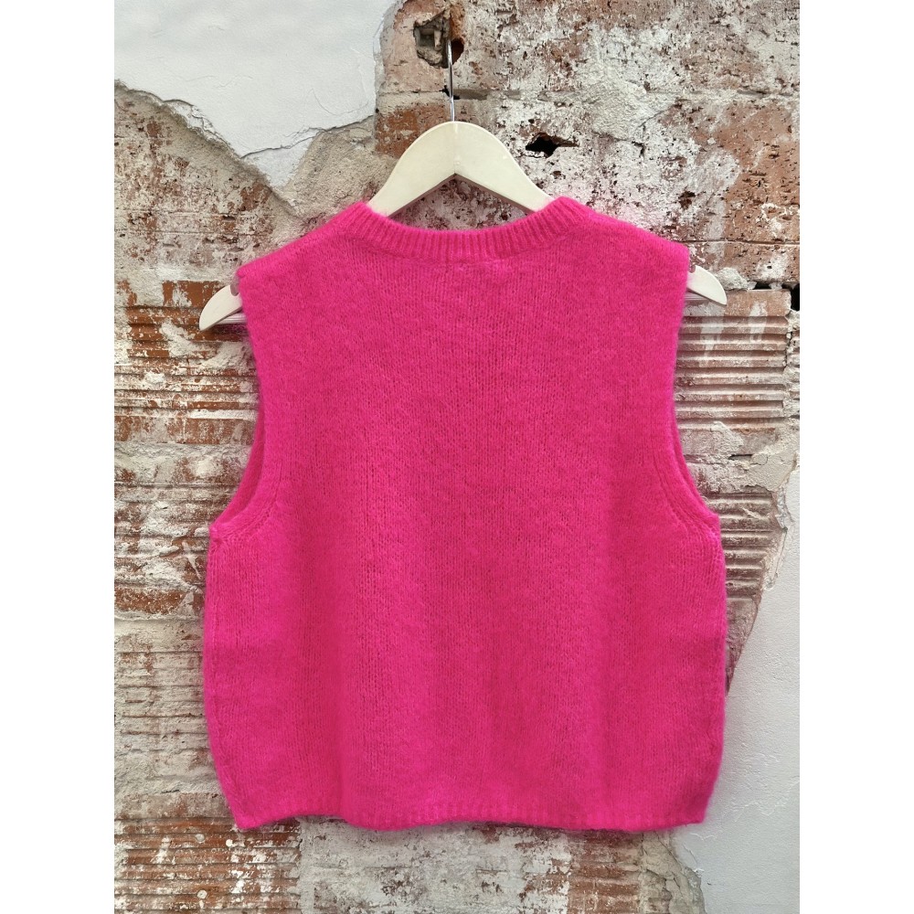 Chaleco de punto con cuello redondo y cierre mediante botones nacarados.