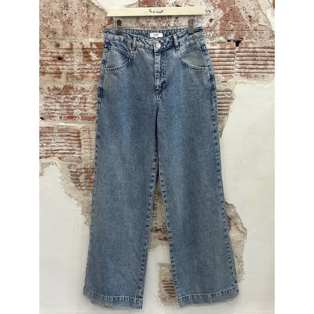 Vaquero azul lavado, de pierna recta y tiro medio.